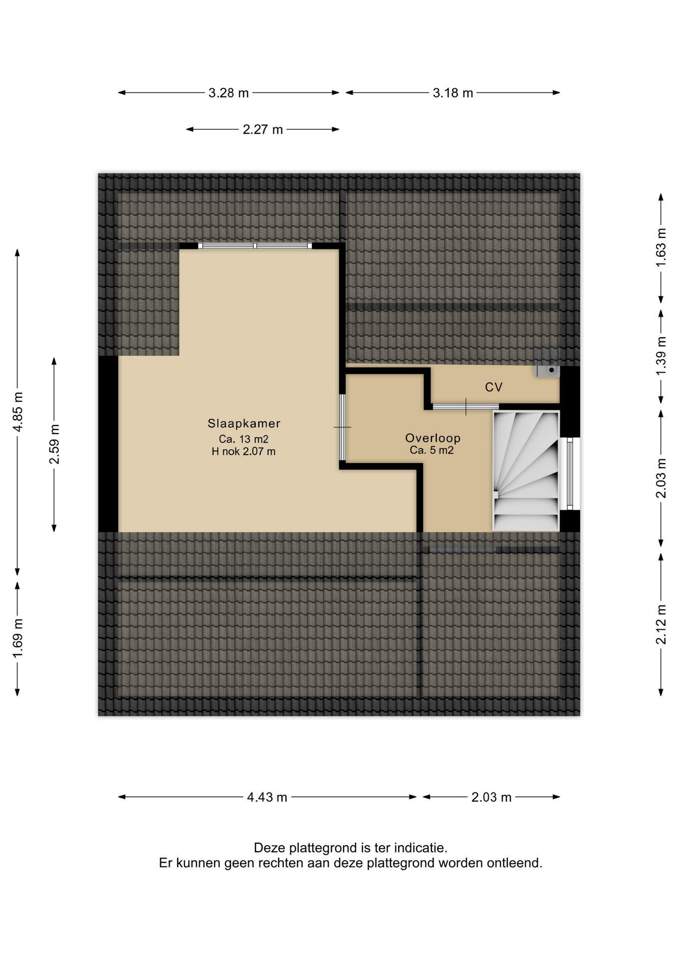 Overloop met aparte bergruimte, waar de cv-ketel staat opgesteld, en keurige slaapkamer (ca. 13m2) met dakkapel.